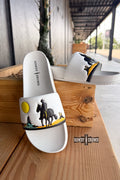 Saddle up in style with our Saddle Bum Slides. Featuring a striking silhouette of cowboys riding into the sunset, these comfy sandals blend laid-back vibes with a rugged edge. Lightweight and easy to to slip on, they're perfect for rodeo days, lake trips, or just kickin' it around town.